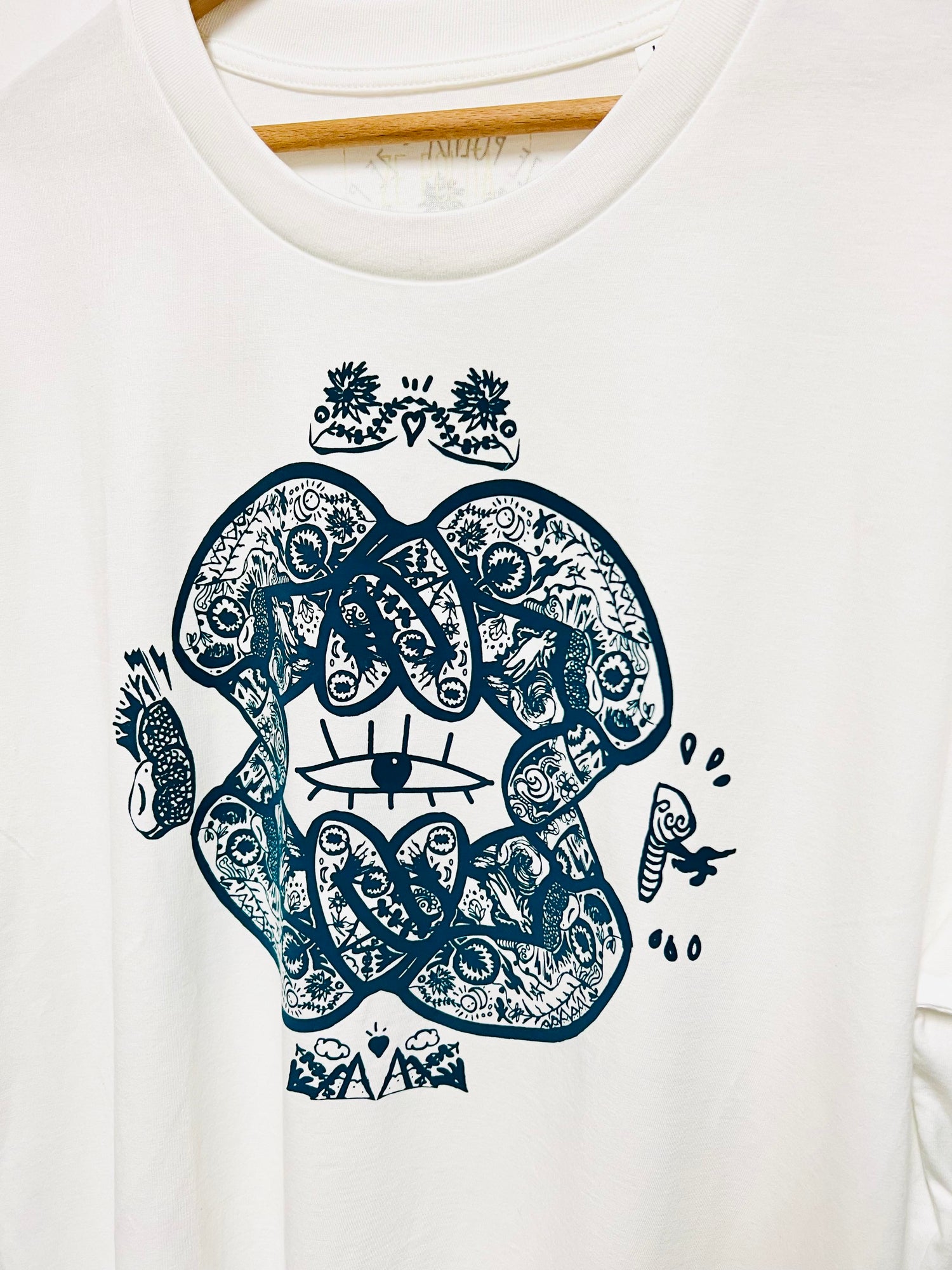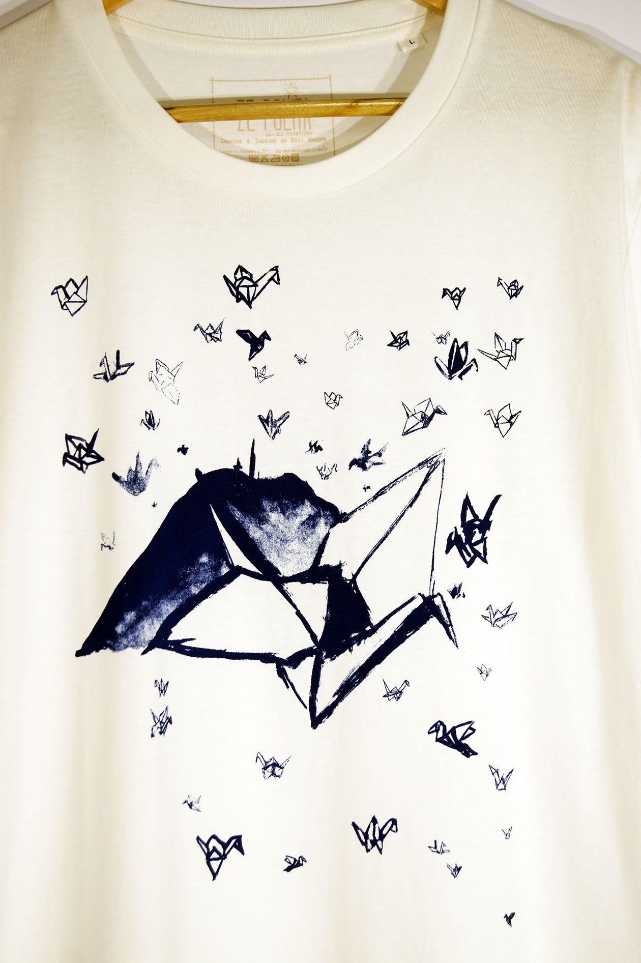 Dans un Monde toujours plus confus, une Nature en danger et une Paix relative, j'ai voulu représenté un petit souffle de poésie et même si il n'y a pas 1000 grues sur mon dessin le fait de l'avoir imprimé en série et de le voir porté symbolise pour moi ma petite prière pour demain.