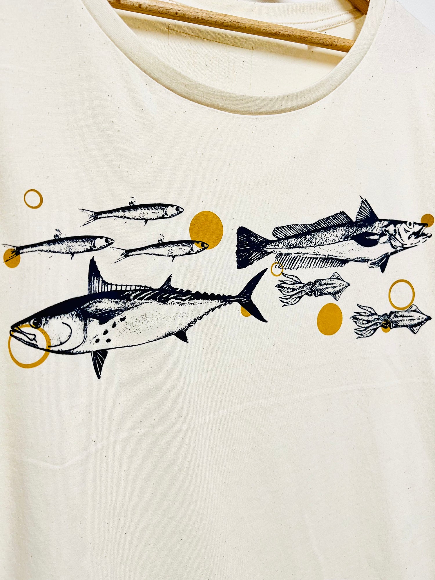 La richesse de la pêche locale ici dessinée façon gravure, pour rendre hommage à cette pratique caractéristique du Pays-Basque profitant d'une faune aquatique variée.Au menu : un petit banc d'anchois, un merlu, une bonite et quelques xipirons tout frais !