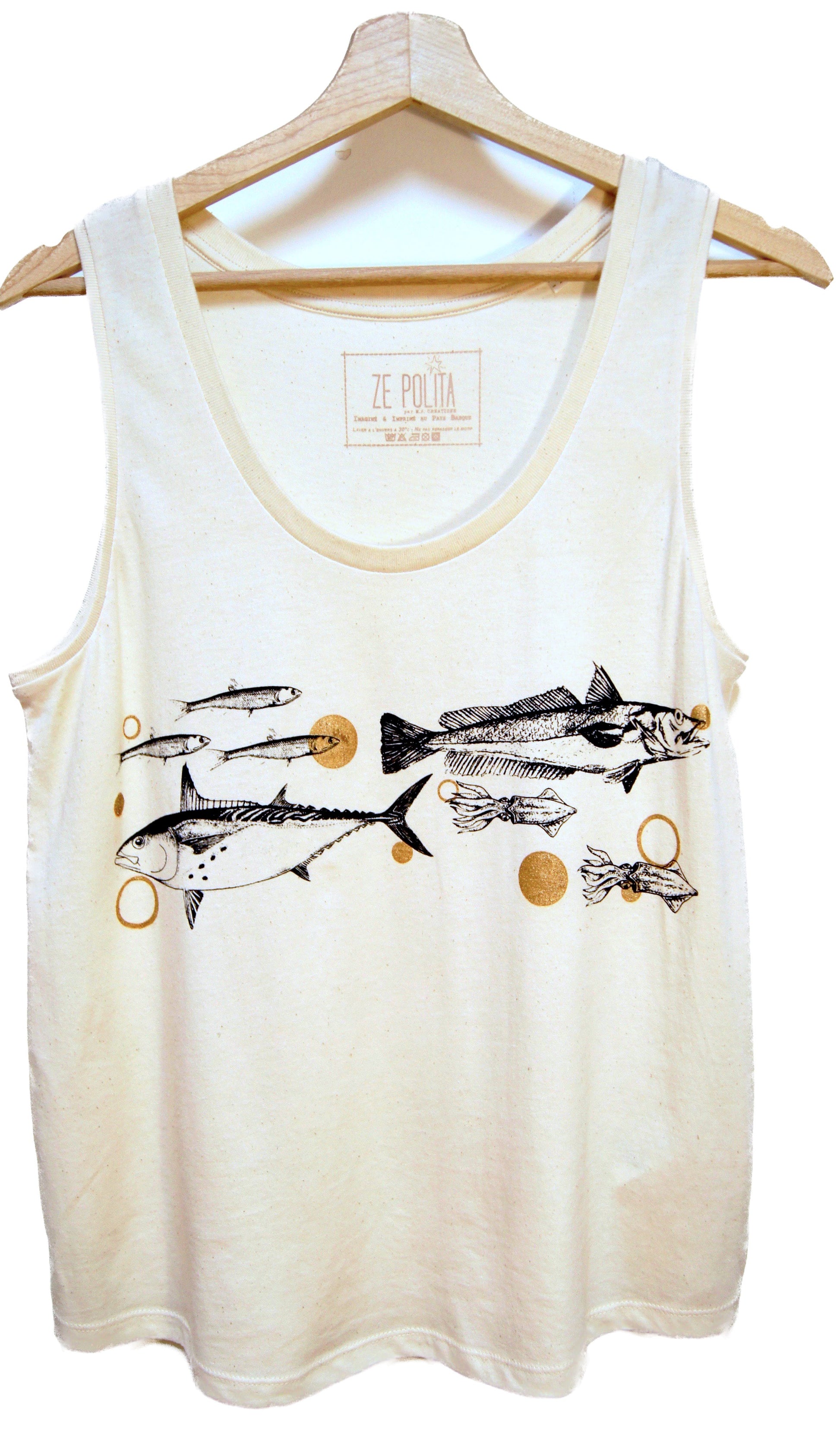 La richesse de la pêche locale ici dessinée façon gravure, pour rendre hommage à cette pratique caractéristique du Pays-Basque profitant d'une faune aquatique variée.