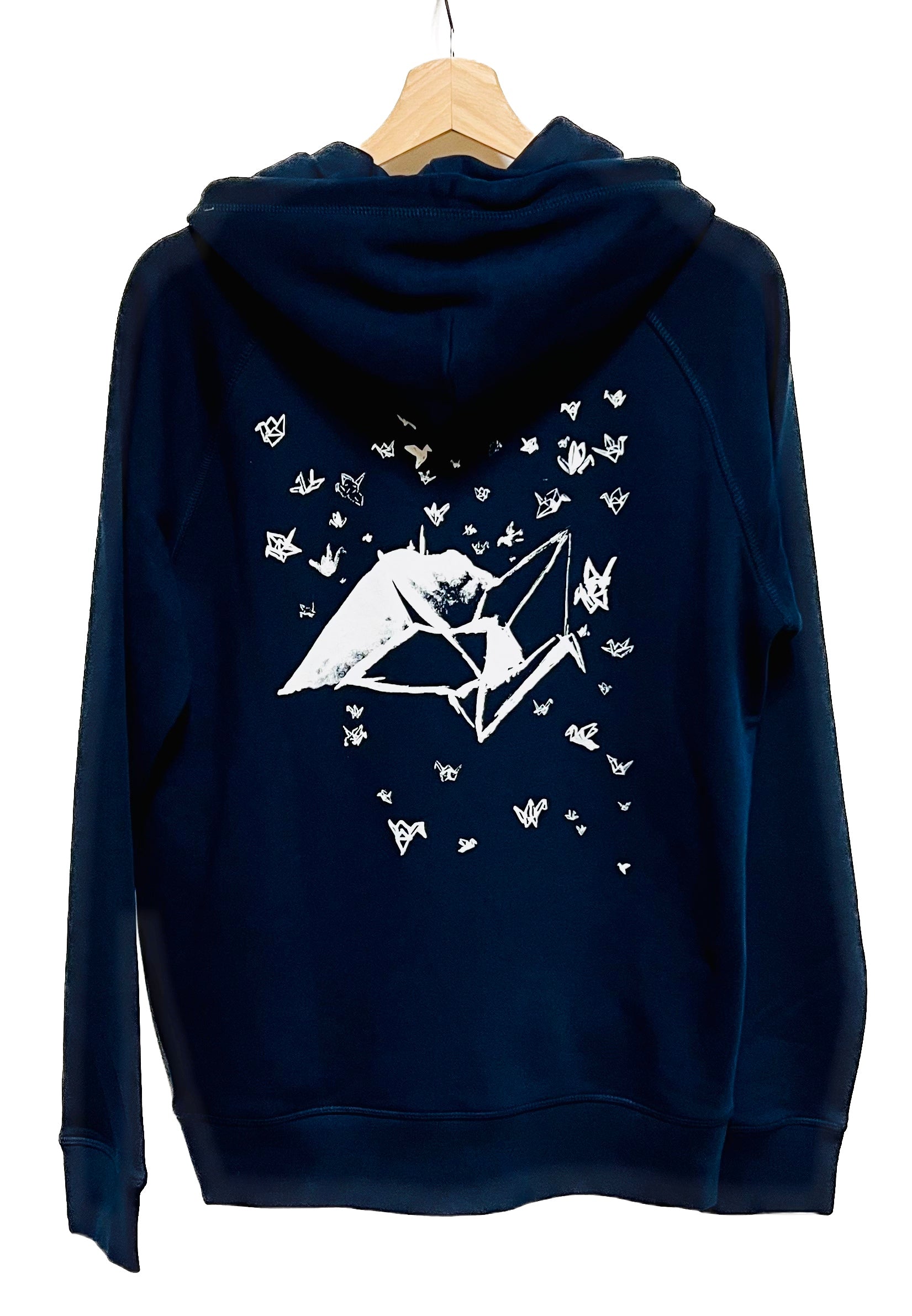 Dans un Monde toujours plus confus, une Nature en danger et une Paix relative, j'ai voulu représenté un petit souffle de poésie et même si il n'y a pas 1000 grues sur mon dessin le fait de l'avoir imprimé en série et de le voir porté symbolise pour moi ma petite prière pour demain.