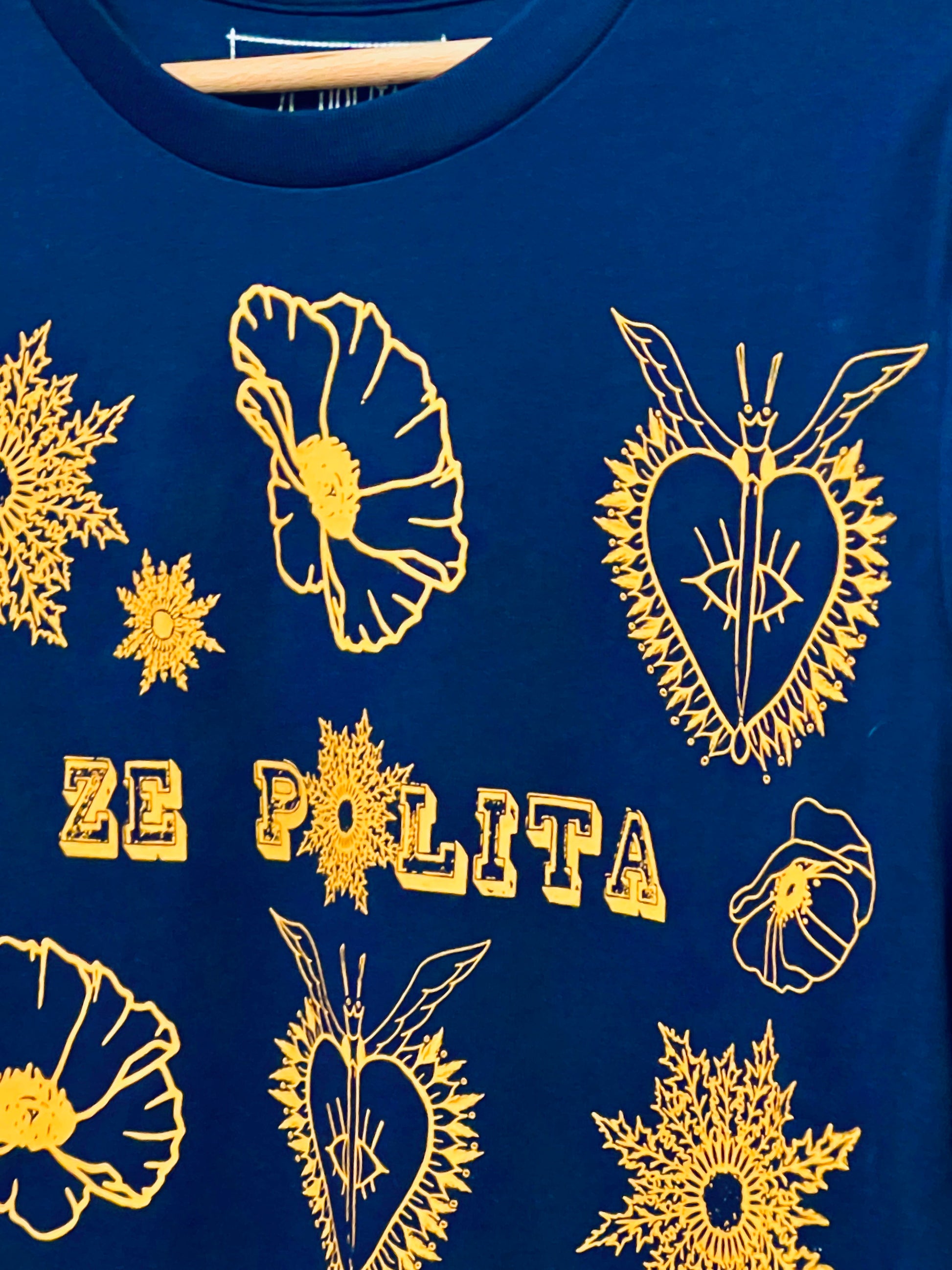 Sérigraphié en ochre jaune* par nos soins à la main avec des encres à eau.