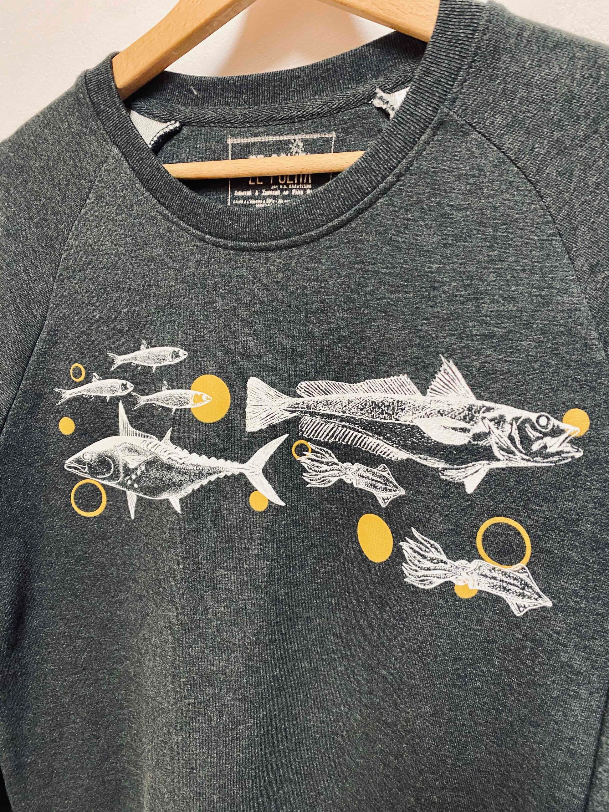 La richesse de la pêche locale ici dessinée façon gravure, pour rendre hommage à cette pratique caractéristique du Pays-Basque profitant d'une faune aquatique variée.